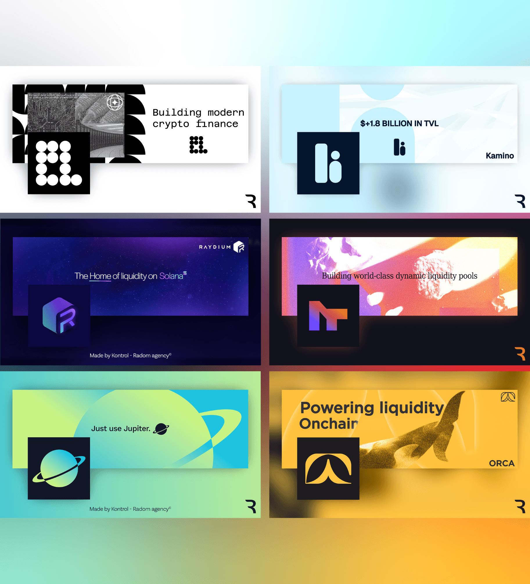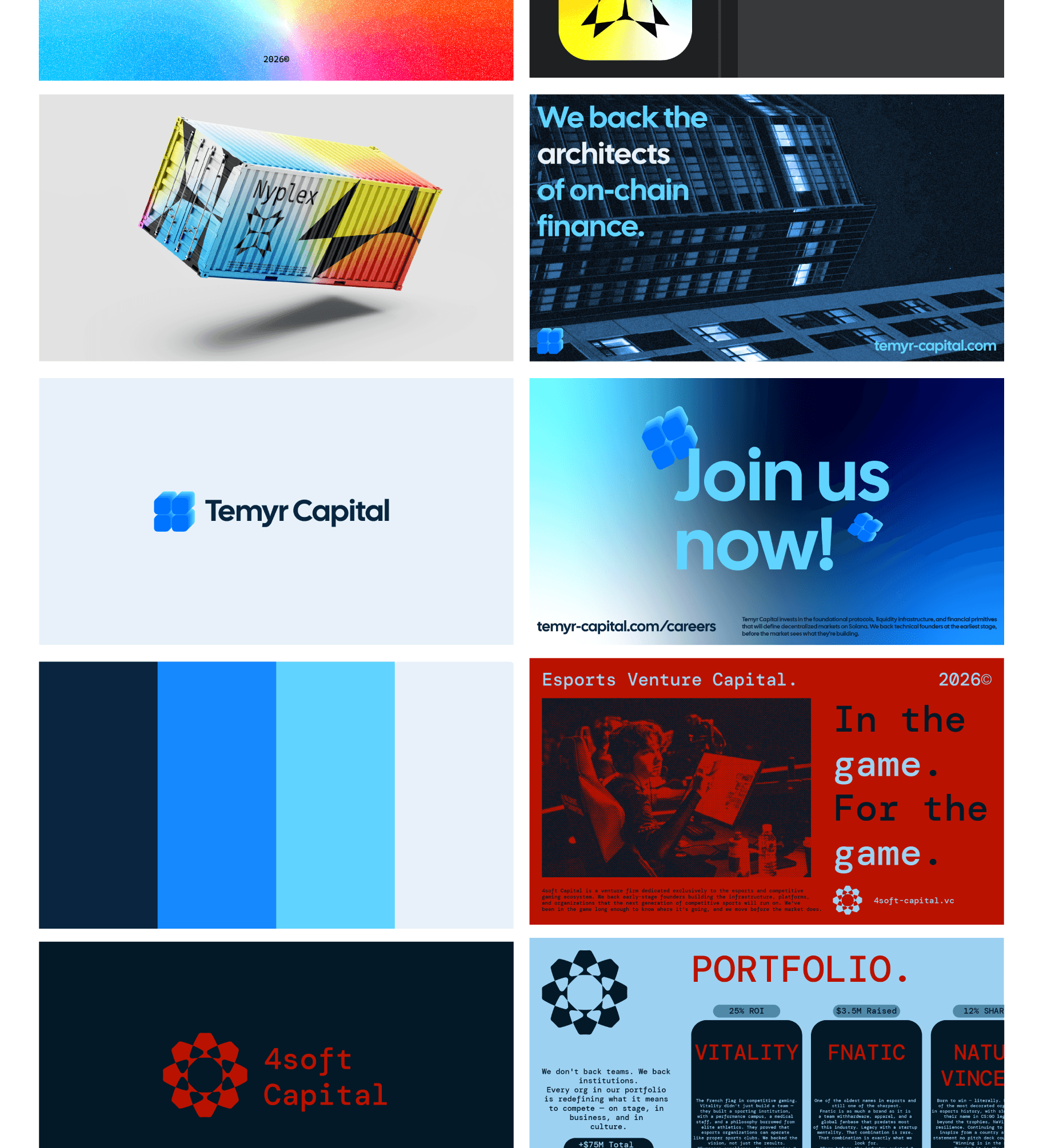 We worked on different kinds of projects. From designing complete visual identities to crafting single brand visuals, we made a lot of various projects. We also experience in different industries, from Crypto/Web3 switching to AI, SaaS and Esports, we developed an adaptability capability.